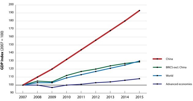 While the Western press is seized by the storyline of “China’s economic slowdown,” few pause to note that China’s lower growth rate remains more than three times that of the United States. Many observers outside China have missed the great divergence between China’s economic performance and that of its competitors over the seven years since the financial crisis of 2008 and Great Recession. That shock caused virtually all other major economies to falter and decline. China never missed a year of growth, sustaining an average growth rate exceeding 8 percent. Indeed, since the financial crisis, nearly 40 percent of all growth in the global economy has occurred in just one country: China. The chart below illustrates China’s growth compared to growth among its peers in the BRICS group of emerging economies, advanced economies, and the world. From a common index of 100 in 2007, the divergence is dramatic.