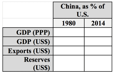 My lecture on this topic at Harvard begins with a quiz that asks students to compare China and the United States in 1980 with their rankings today. The reader is invited to fill in the blanks.