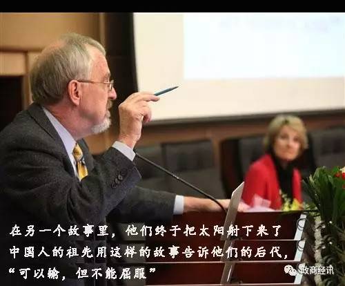 在另一个故事里,他们终于把太阳射下来了(后羿射日),中国人的祖先用这样的故事告诉后代:可以输,但不能屈服。中国人听着这样的神话故事长大,勇于抗争的精神已经成为遗传基因,他们自己意识不到,但会像祖先一样坚强。因此你们现在再想到中国人倔强的不服输精神,就容易理解多了,这是他们屹立至今的原因。”