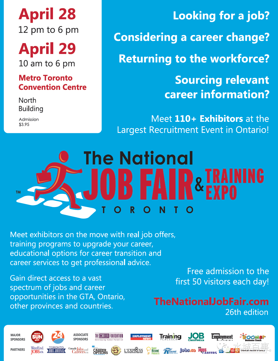 4月28和29,半年一度的加拿大国家招聘和培训展览会,将在在多伦多会展中心开幕(Metro Toronto Convention Centre NorthBuilding, Hall C)。入场费每人3.95元,前50人免费。