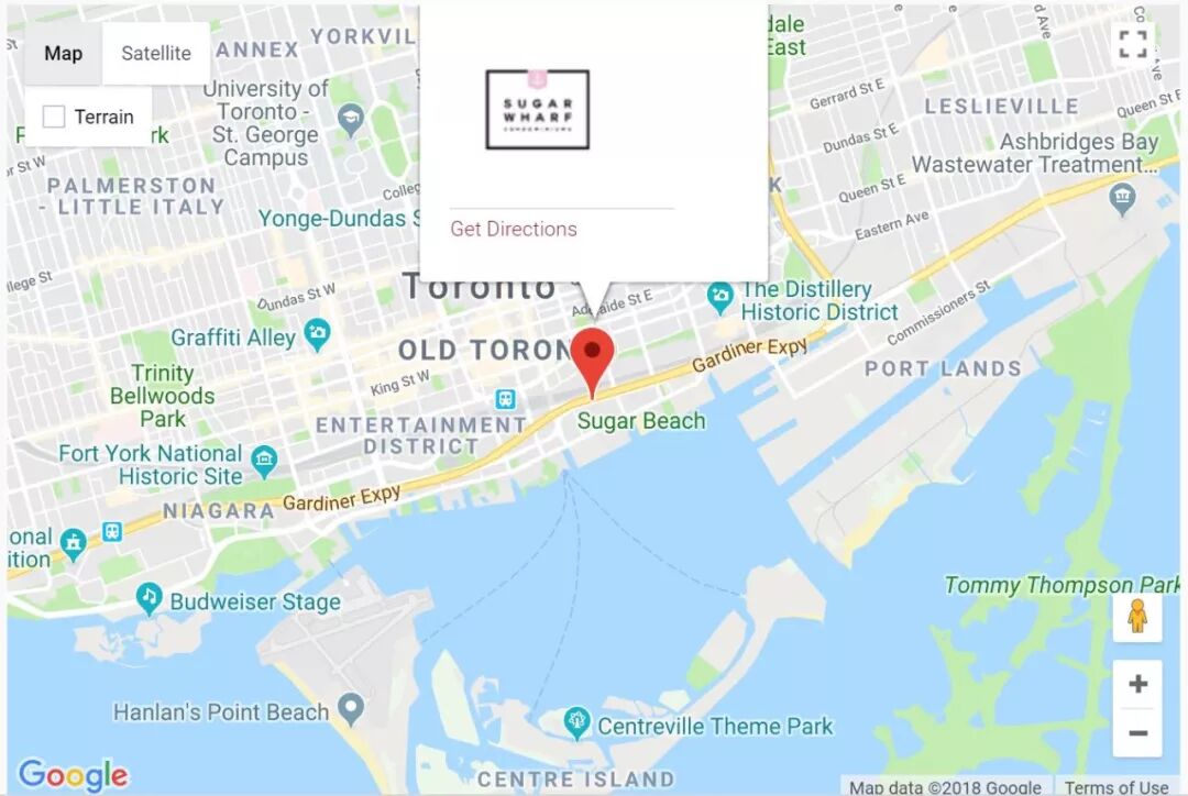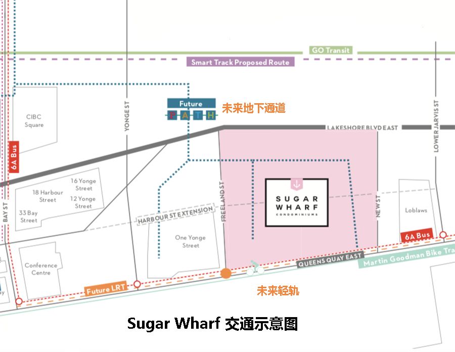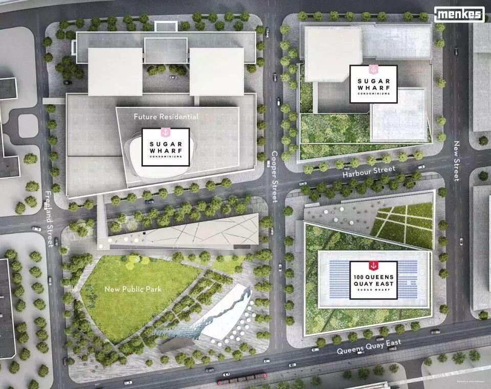 Sugar Wharf Community占地逾11英亩,位于皇后码头东Queens Quay East / Freeland St,与Yonge St相隔1个街区。包括5座高幢公寓、1座中幢出租住宅大厦、写字楼(即新的LCBO总部)、零售物业及一个新的公立小学。公寓西面是学校,西南面为公园,融合现代都市建筑的特色,同时享受安大略无敌湖景和多伦多都市生活气息。