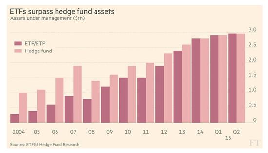 截至去年二季度末,全球ETF管理资产规模首度超越对冲基金。全球ETF和ETP所管理的资金规模达到2.971万亿美元,较一季度增加450亿美元。同期全球对冲基金只增加了300亿美元,总规模2.969万亿美元。