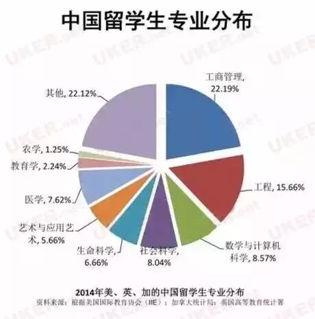 2014年美国、英国、加拿大的中国留学生专业分布来看,中国留学生的专业分布,以商科、STEM(科学、技术、工程、数学)领域为主。