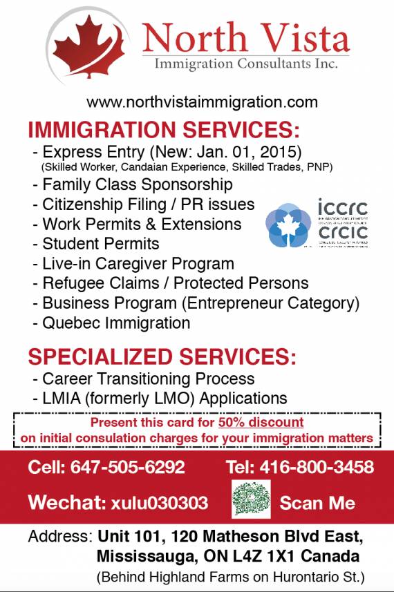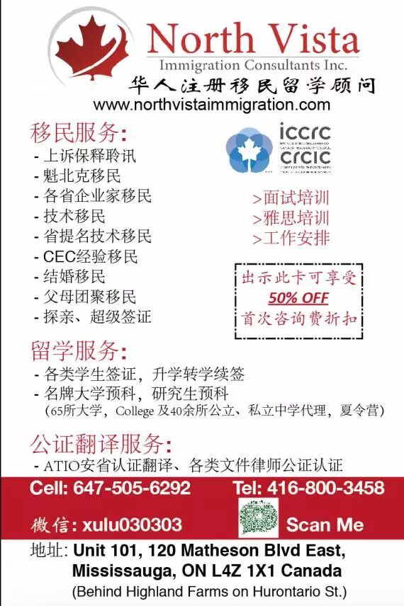 提醒您选择注册移民顾问!!!(请Google "ICCRC" 了解注册移民顾问监管机构,或去www.iccrc-crcic.ca 在“find a professional"处能够查到您的移民顾问是否注册,不是注册移民顾问收取费用是违法的,您的权益也没有保障,上方是打击”Ghost Consultant"的宣传片) www.northvistaimmigration.com