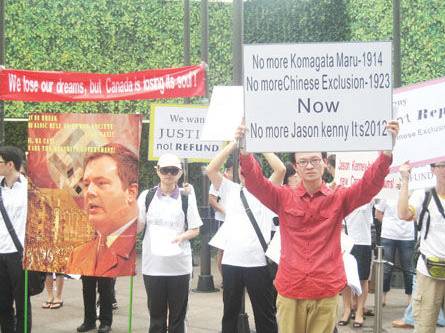 当年受"一刀切"影响的申请人,在加拿大领事馆前抗议。